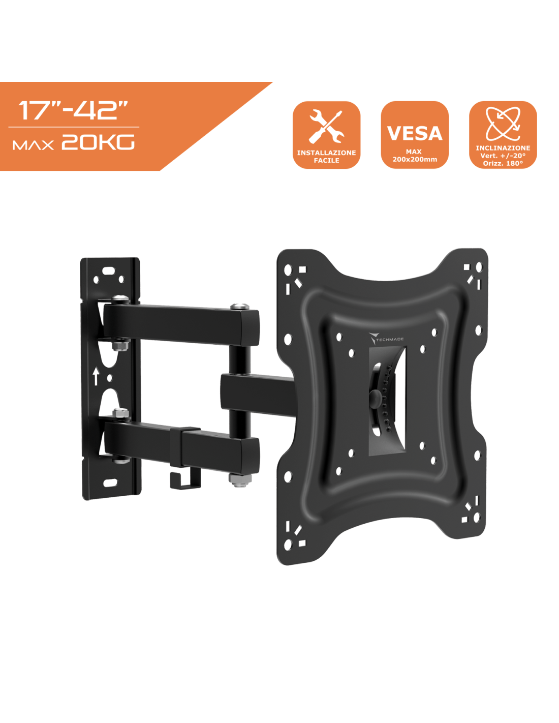 Materiale Acciaio laminato a freddo Max VESA 200x200mm Per LCD TV 17"-42" Distanza tra TV e parete 60-370mm Carico massimo 20kgs/44lbs Inclinazione Verticale +/- 20 gradi, Orizzontale 180 gradi Organizzatore di cavi Si Installazione facile Si
