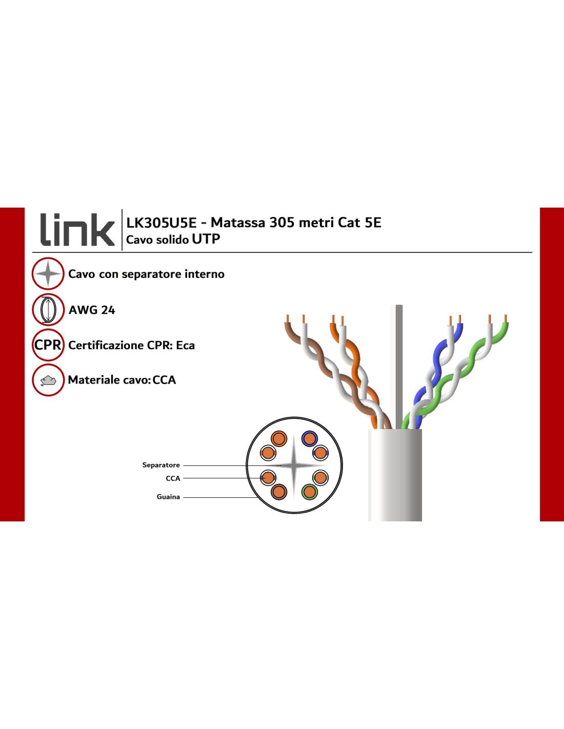 CAVO SOLIDO UTP PER RETI CATEGORIA 5E AWG24 MATERIALE CCA MATASSA MT 305 CLASSE